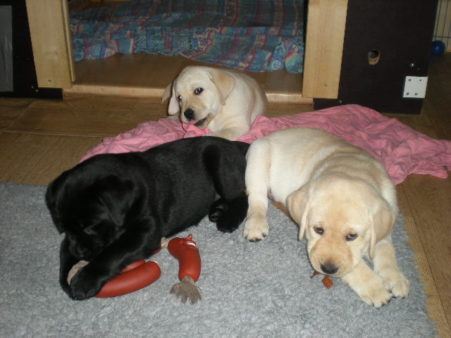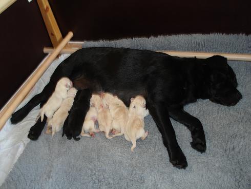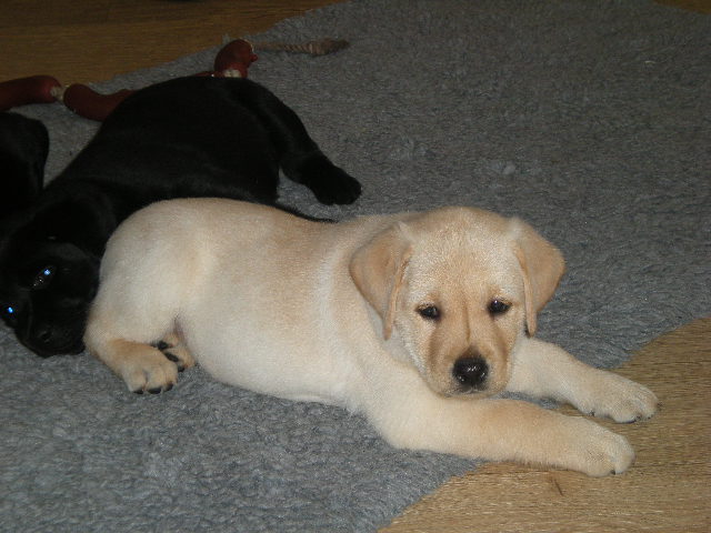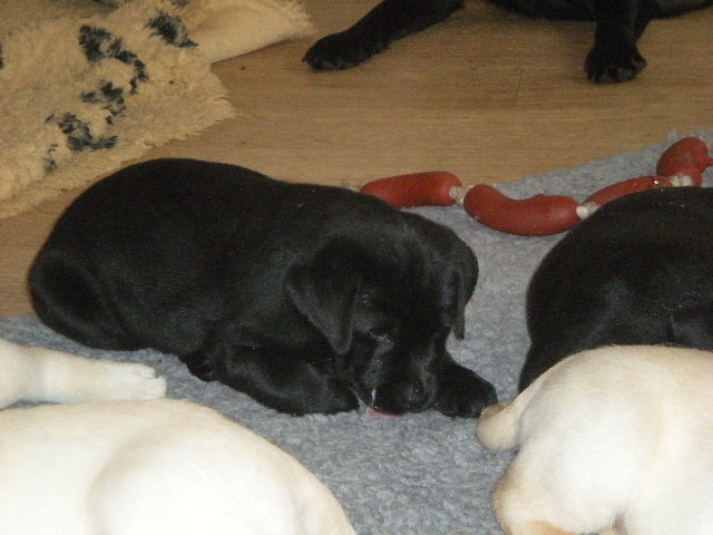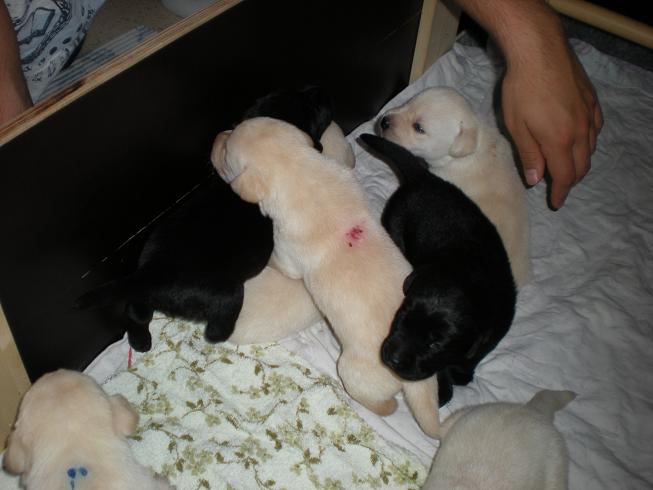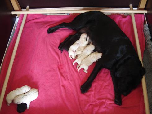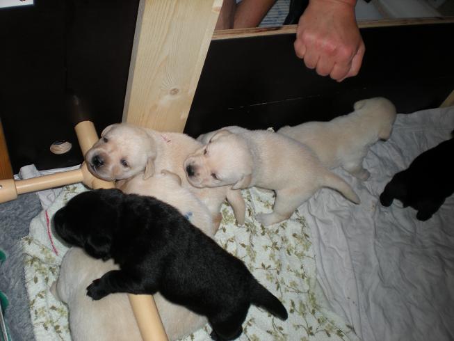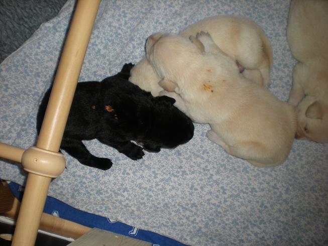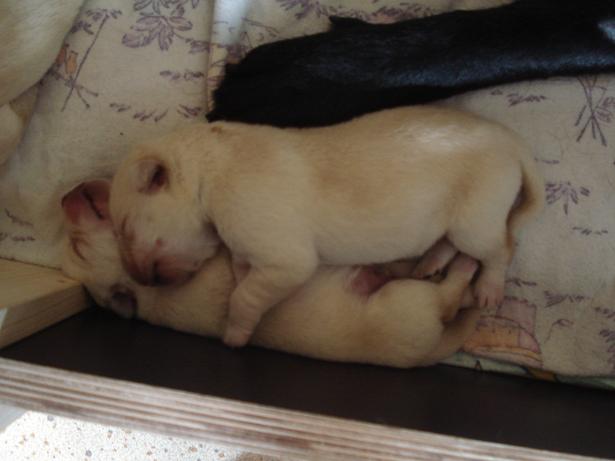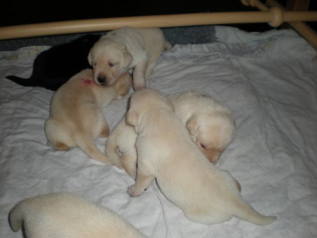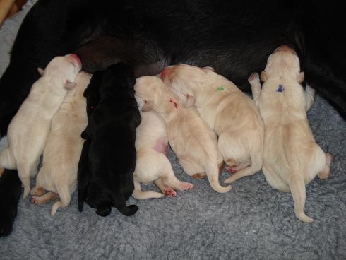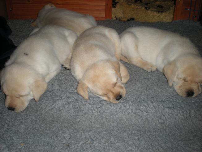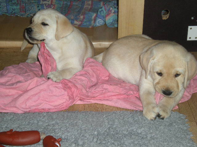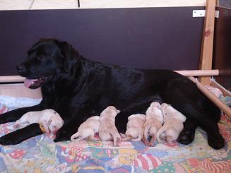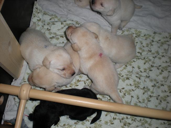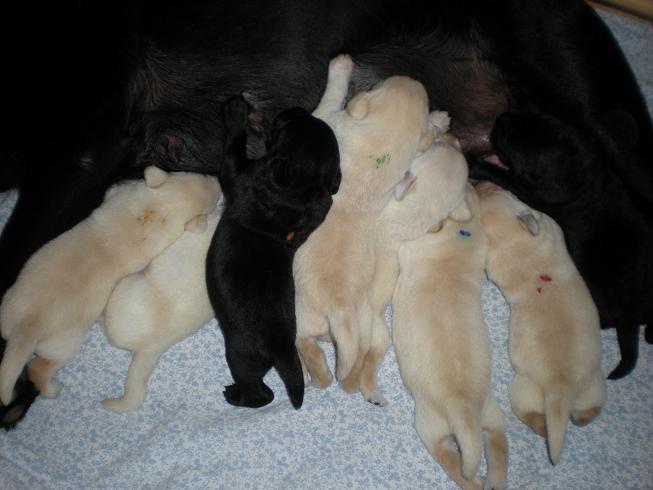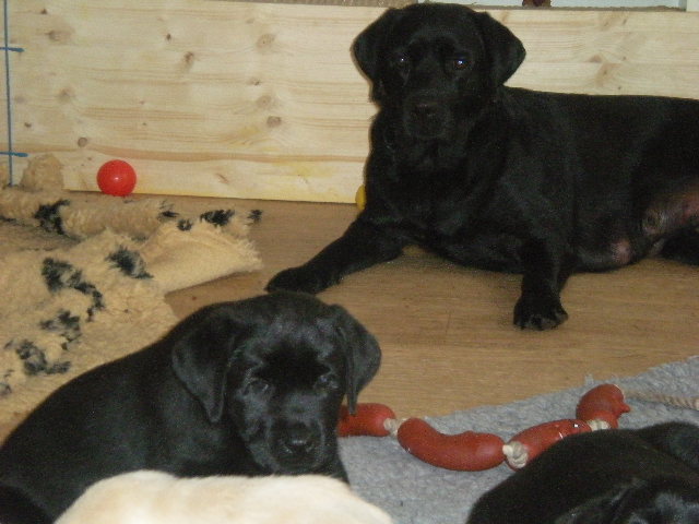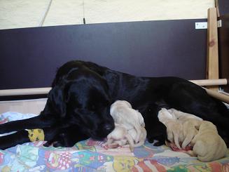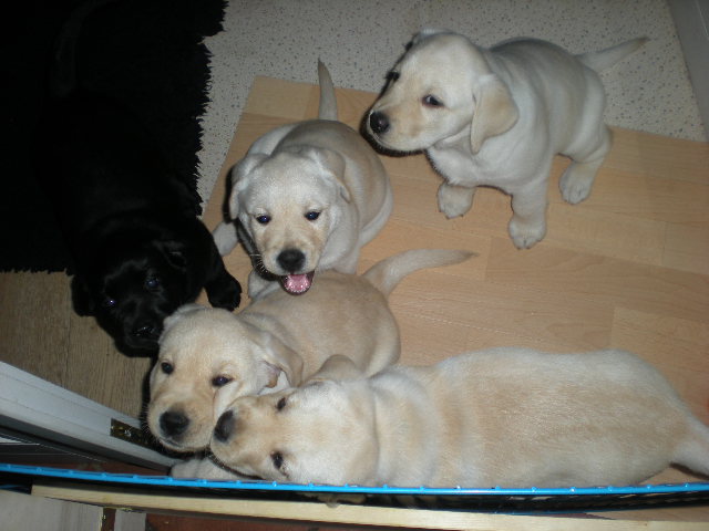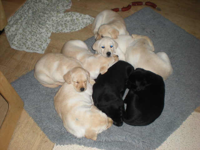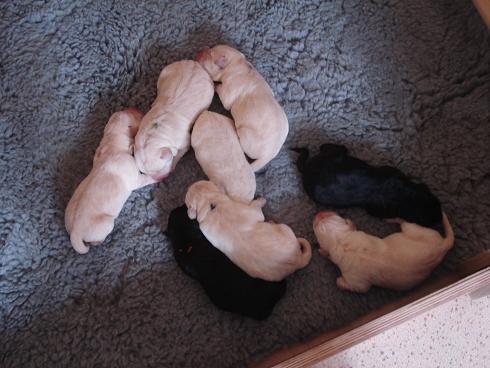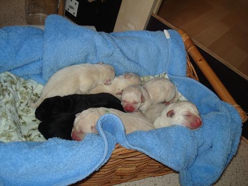 geboren. Es sind 2 schwarze Hündinnen, 2 gelbe Hündinnen und 4 gelbe Rüden.